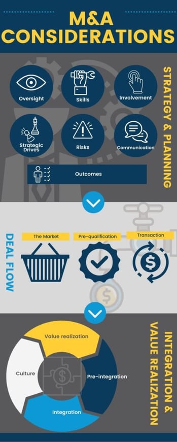 Integration & Value RealizationThe importance of integration has gained appreciation over time, primarily as people realized that a poorly executed integration plan can be detrimental to achieving the value expected from the acquisition. Value realization – Align on key metrics and ensure you have visibility into these metrics in a timely manner. The metrics should be the key indicators to showing that the value expected to be acquired, is indeed being realized. Pre-integration – Are the pre-integration steps ready prior to signing of the purchase agreement? Laggard integrations create the opportunity for value and synergy leakage, as well as cultural challenges. Integration – Back to the oversight aspects, does the management team have key integration expertise and resources assigned? Depending on size of the M&A, are the resources dedicated to this work or are they doing it on top of their day jobs? The quality of integration plans is quite varied and ensuring adequate oversight with a senior integration leader is paramount. Culture – Has the management team adequately assessed the culture of the acquiree? One of the biggest triggers of unrealized value is underestimating the impact of cultures and failing to proactively merge them. Good cultural integration happens by design, not luck. Successful M&A transactions take a great deal of planning, careful execution and objective assessment. The board, with its fiduciary obligations, must ensure proper oversight especially when they are large or carry potential risks. |